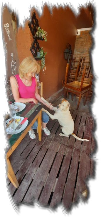Nach unserem Ausflug zum Kloster Marianela beim Mittagessen. Regina hat sich gleich mal in dieses Hündchen verliebt.