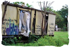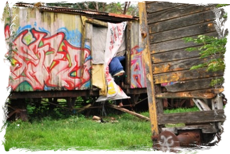 Am alten Bahnhof. Hier wohnen doch tatsächlich Leute in den uralten Waggons.