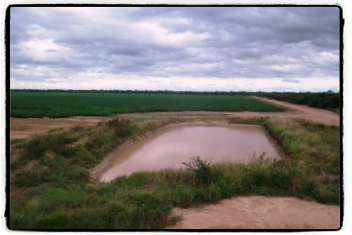 Das Wasser aus dem Tajamar wird hochgepumpt in ein Bassin, siehe rechts, und zur Bewässerung der Felder verwendet. Gleichzeitig nutzt man diese Wasserstellen auch als Viehtränke.