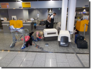 Als wir in Richtung Gepäckausgabe liefen, standen dann unsere 2 Boxen einfach mal so da. Jeder hätte die mitnehmen können. Hat auch niemand gefragt, ob wir die Eigentümer der Hunde wären. Dann ging es weiter zum Zoll. Aber wir hatten ja unsere Papiere alle beieinander, somit war es absolut kein Problem.