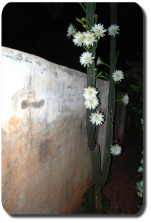 Wunderschön blühen diese Kakteen. Aber immer nur in der Nacht. Es sind so viele Blüten, dass wir uns jede Nacht dran erfreuen können.