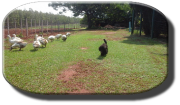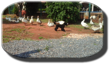 Denny ist völlig tiefenentspannt im Umgang mit den Gänsen. Er würde wohl gerne mal ein wenig näher an diese Gesellen herangehen, aber er hat absoluten Respekt vor ihnen. Wenn er ihnen freudig entgegen springt und zum Spielen auffordert, und er angefaucht wird, macht er ganz schnell ein Kehrtwendung in Richtung Frauchen.