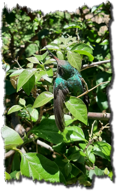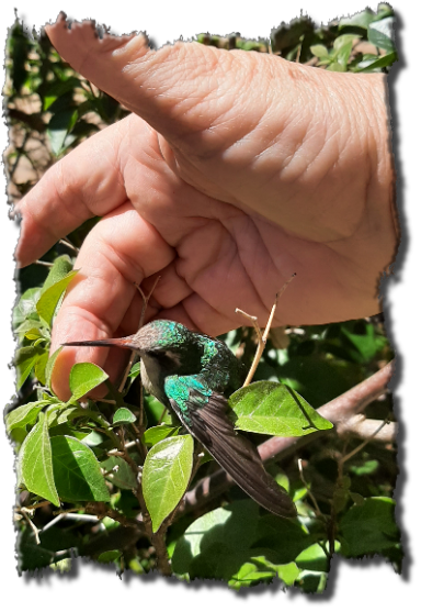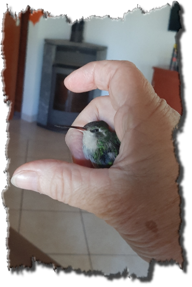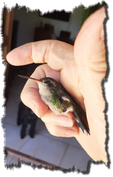 Heute hat sich wieder ein kleiner Kolibri zu uns verflogen. Ein paar Stunden flatterte er ganz aufgeregt an der Wohnzimmerdecke herum. Nach einer gefühlten Ewigkeit setzte er sich völlig erschöpft auf einen Stern, der an unserer Eßzimmerlampe hängt. Nun war meine Chance gekommen, den Kleinen einzufangen. Ganz langsam stieg ich auf den Tisch und griff nach ihm. Ich musste sehr vorsichtig sein, denn vor Angst krallte er sich in den Aufhängedraht.